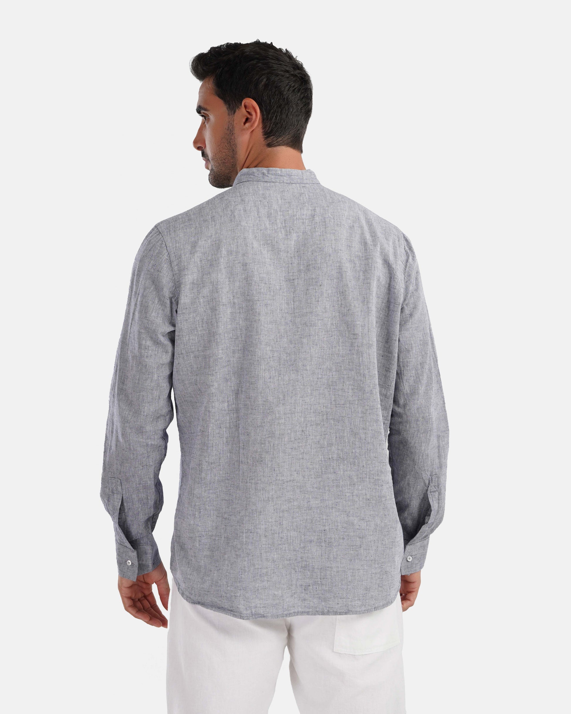 Long sleeves, mandarin collar, hazard linen shirt.