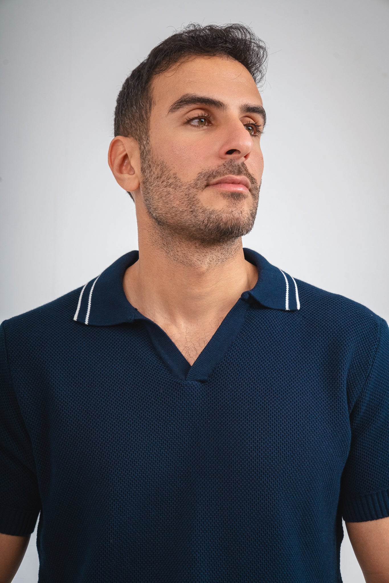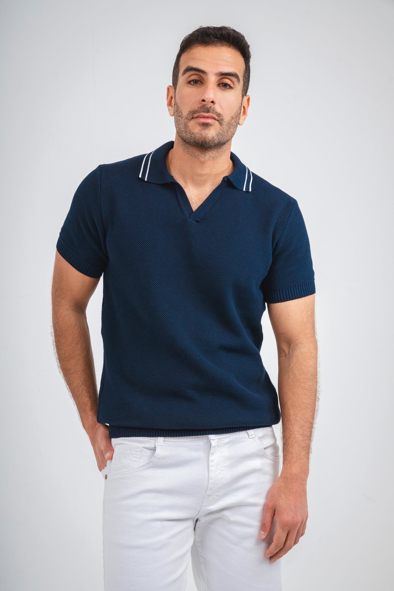 Contrasted Collar Knit polo Shirt - Navy Blue