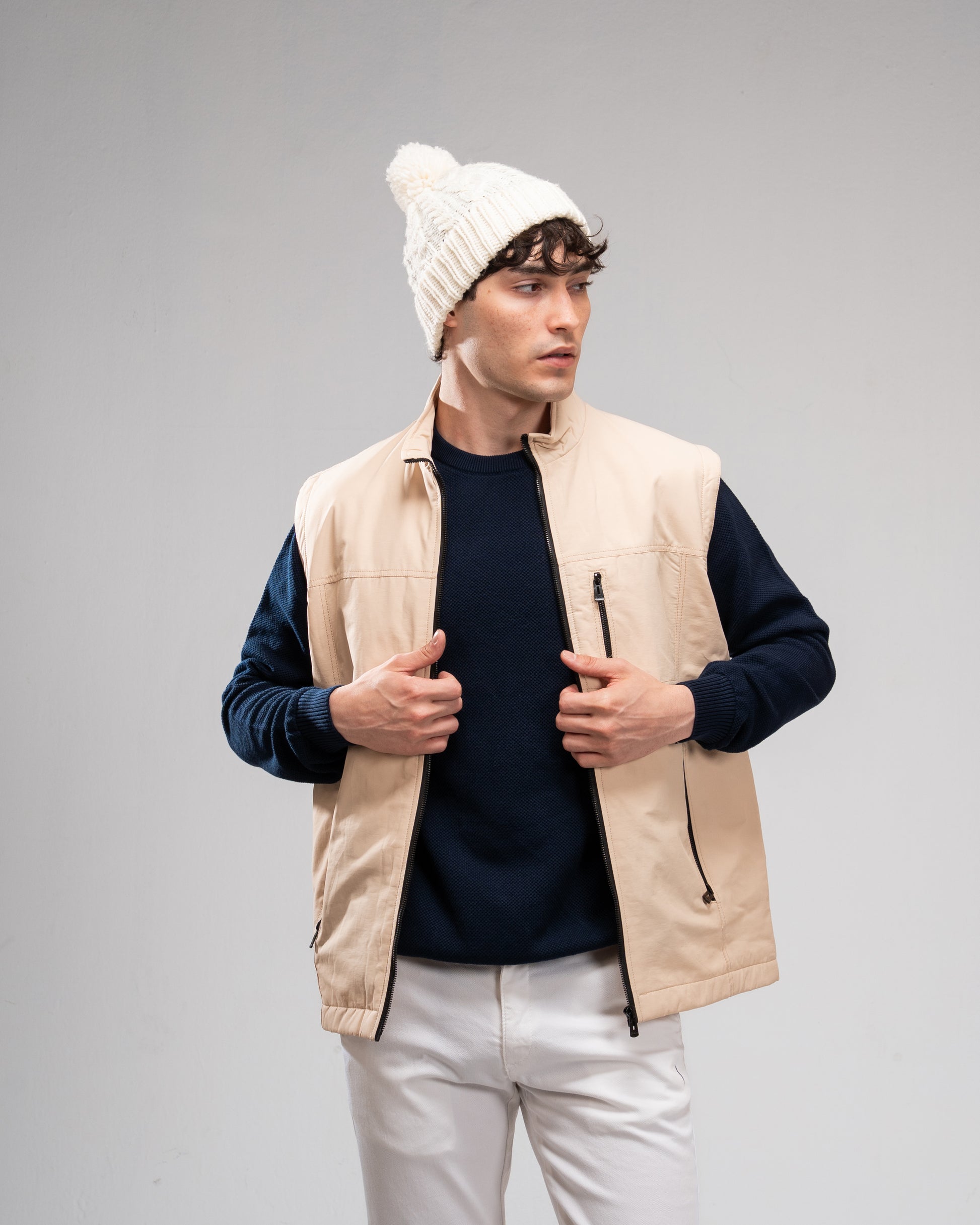 Lightweight water proof vest with a hood, zip fastening, pockets.